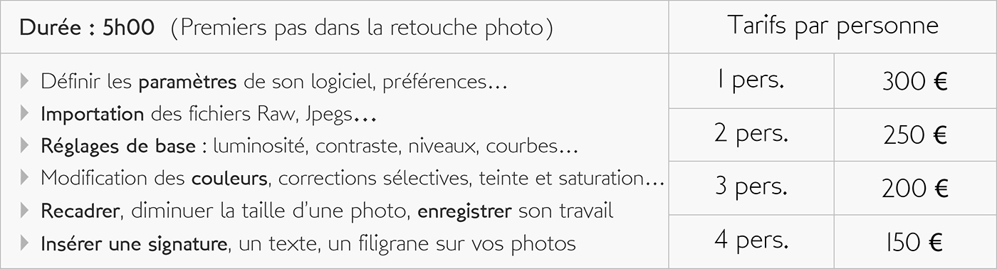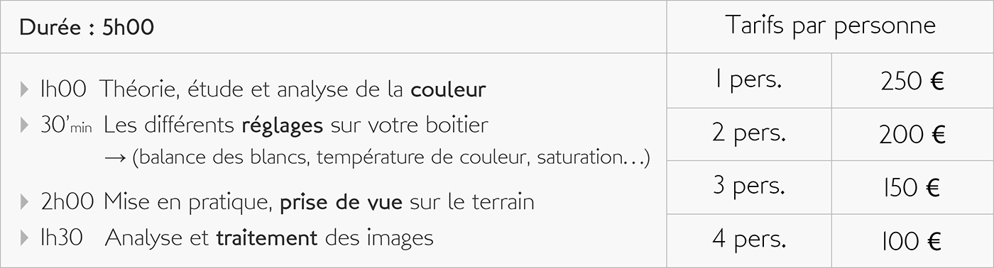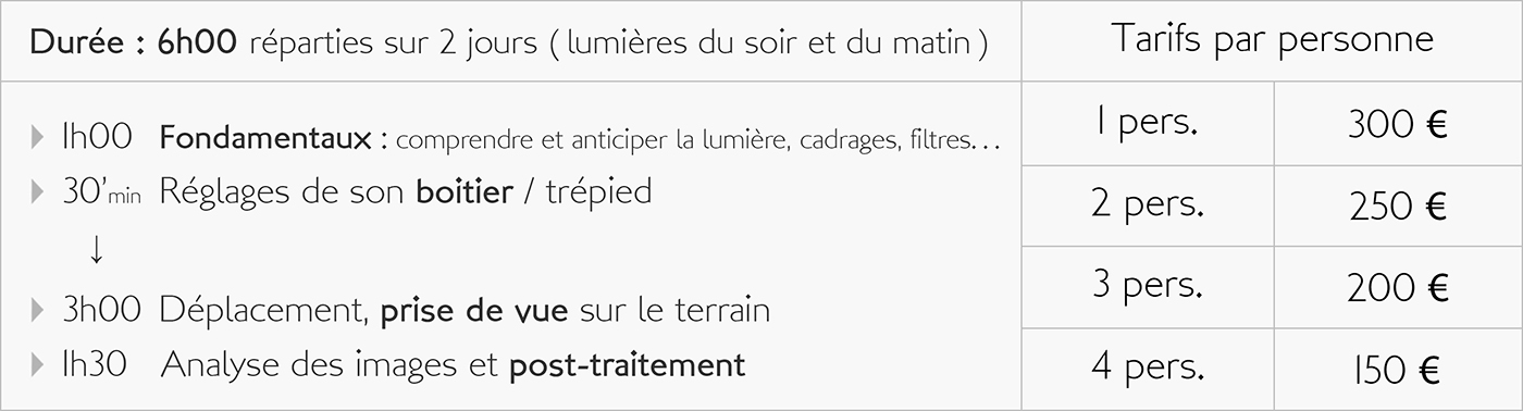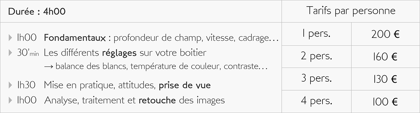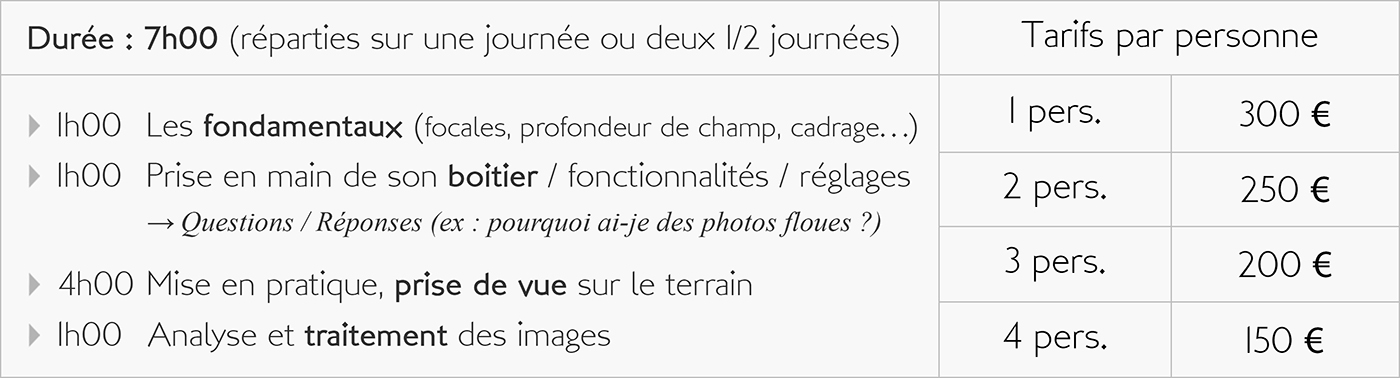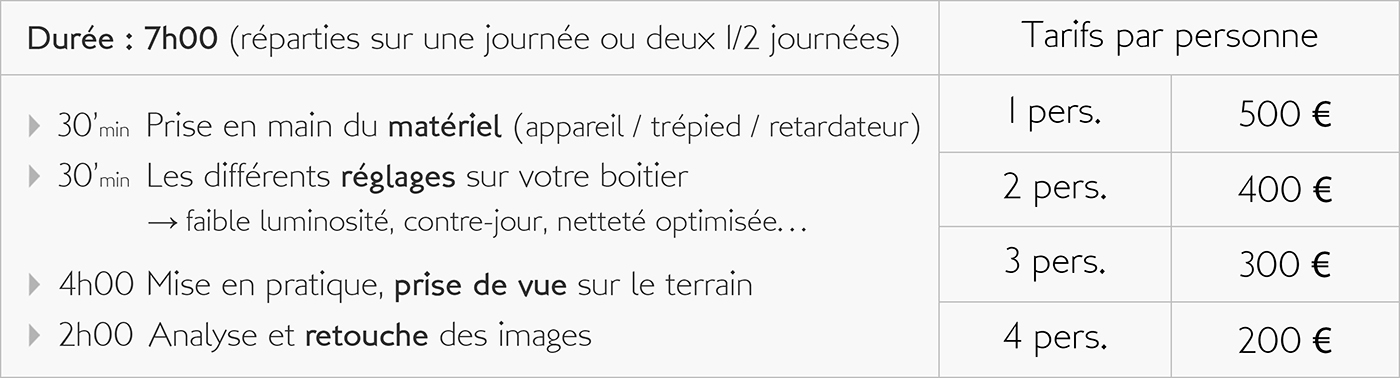 En participant avec moi à des exercices sur le terrain, mais aussi à des activités plus théoriques, vous apprendrez à maitriser votre boitier et ainsi obtenir de lui des images de plus en plus intéressantes. Que vous soyez parfait débutant, photographe amateur, confirmé, ou encore utilisateur de la photo dans le cadre de votre activité professionnelle, la maitrise de votre matériel mais aussi celle des outils de traitement concourent tous deux aux bons résultats de votre pratique photographique.