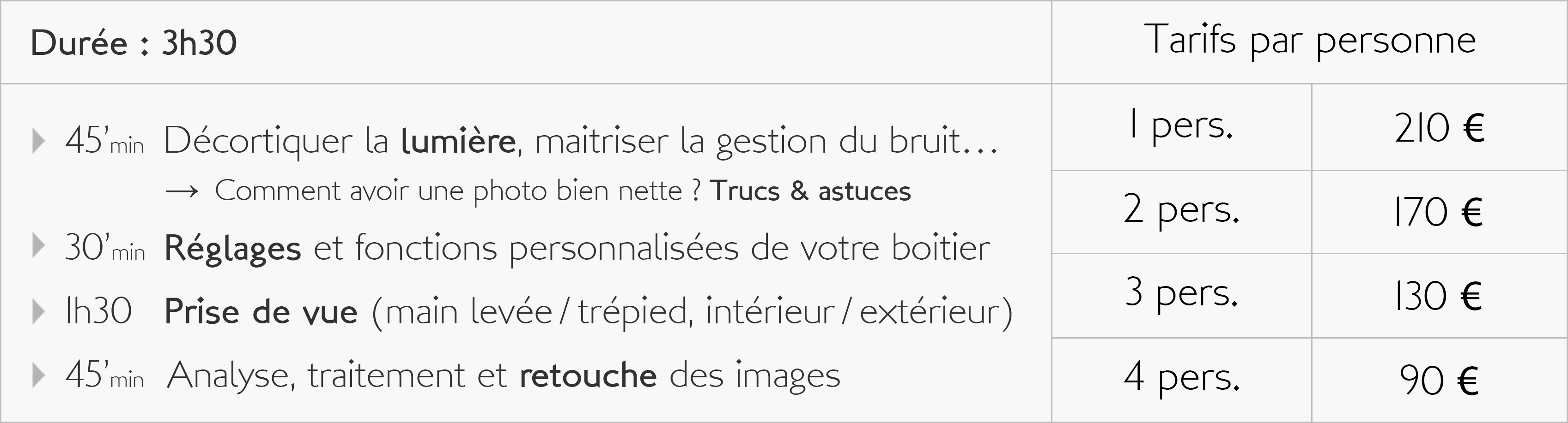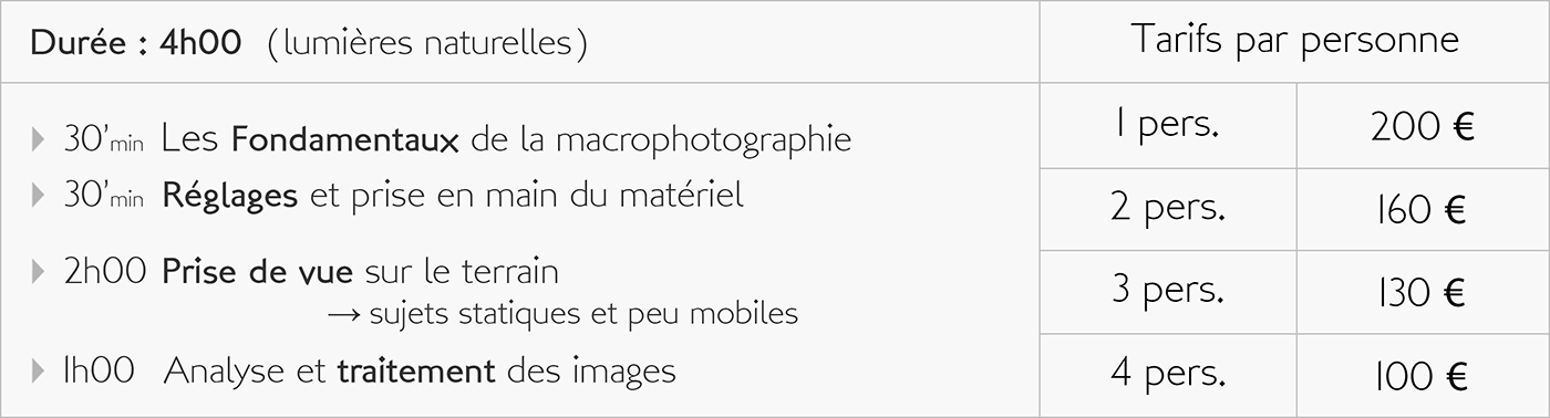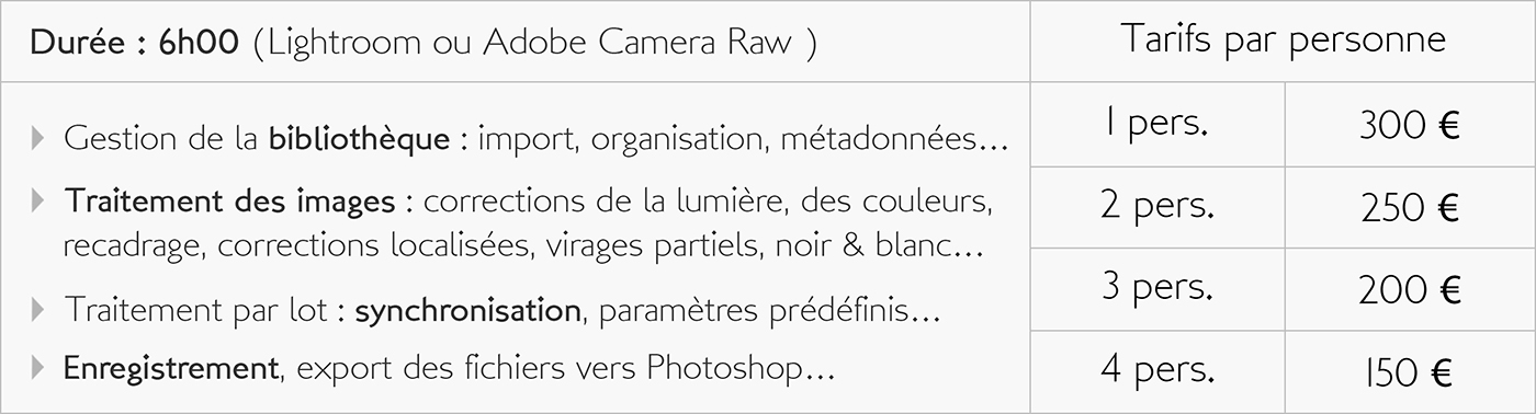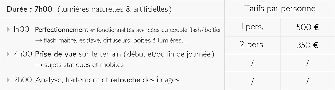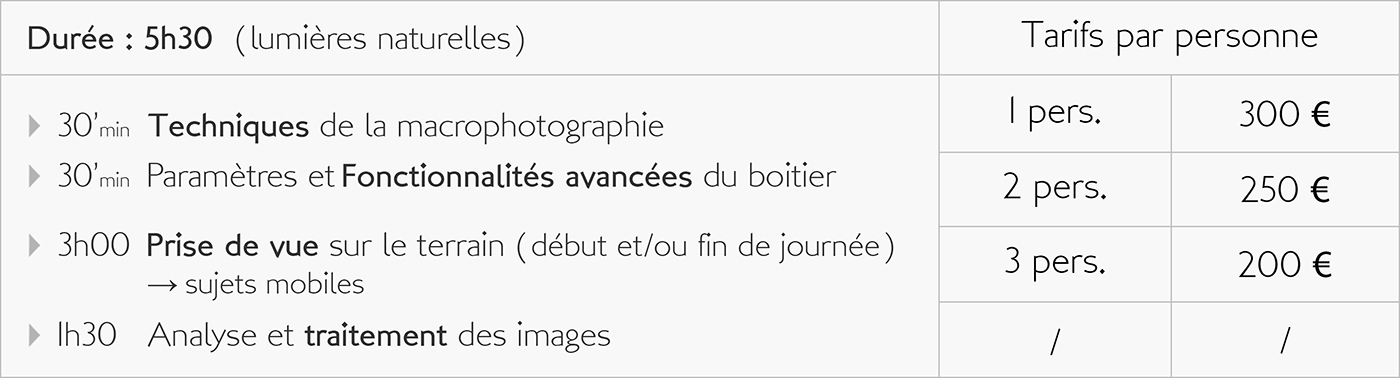 En participant avec moi à des exercices sur le terrain, mais aussi à des activités plus théoriques, vous apprendrez à maitriser votre boitier et ainsi obtenir de lui des images de plus en plus intéressantes. Que vous soyez parfait débutant, photographe amateur, confirmé, ou encore utilisateur de la photo dans le cadre de votre activité professionnelle, la maitrise de votre matériel mais aussi celle des outils de traitement concourent tous deux aux bons résultats de votre pratique photographique.
